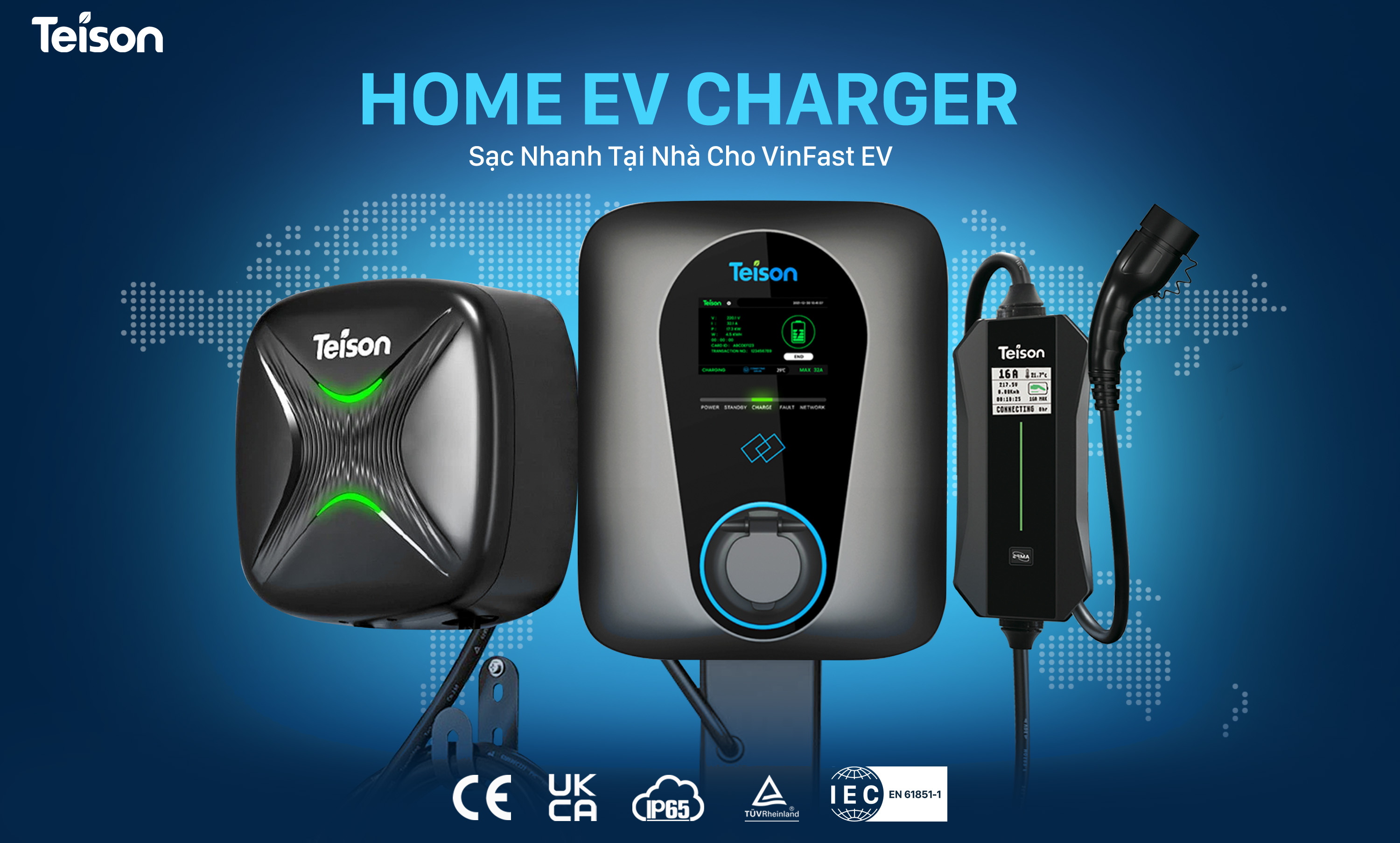Hiện nay trên thị trường đã và đang cung cấp, phân phối nhiều mẫu sạc xe điện nhưng liệu sản phẩm nào là đáng tin cậy ? Để đảm bảo an toàn và chất lượng bộ sạc Teison hẳn là một lựa chọn tuyệt vời cho khách hàng. Bộ sạc được thiết kế hiện đại, bắt mắt với nhiều tính năng thông minh. Giúp người dùng dễ dàng điều khiển, quan sát, đặt lịch sạc một cách dễ dàng thông qua ứng dụng Teison ME. Đồng thời bộ sạc có nhiều dòng sạc với công suất khác nhau, tối đa lên đến 22kW, đây sẽ là giải pháp sạc nhanh và hiệu quả cho xe của bạn. Sản phẩm được thiết kế đạt tiêu chuẩn châu Âu IEC 61851 cho nên khách hàng sẽ không cần lăn tăn về chất lượng khi sử dụng các bộ sạc Teison.